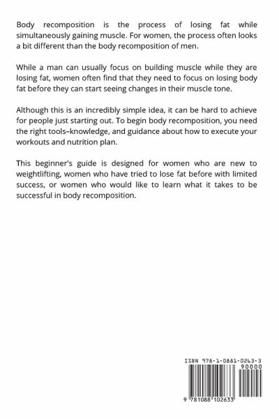 Are you a woman looking to transform your body and enhance your overall well-being? Discover the secrets of body recomposition in this empowering guide designed specifically for women who are new to weightlifting, have struggled with fat loss in the past, or simply want to achieve a healthier, more confident version of themselves. Body recomposition is the art of simultaneously shedding unwanted fat while sculpting lean, toned muscles. While men may often focus on building muscle during their fitness journeys, women frequently find it more effective to prioritize fat loss before achieving their desired muscle tone. In this comprehensive beginner's guide, you'll gain the knowledge and guidance necessary to embark on your body recomposition journey successfully. Prepare yourself mentally for this exciting challenge and understand that the path to muscle growth isn't always linear. Immediate results might not be visible, but with patience and unwavering consistency, you'll witness remarkable transformations over time. Embark on this transformative journey with confidence, knowing that body recomposition offers a more attainable and holistic approach than pursuing fat loss or muscle gain alone. Backed by scientific studies, this guide reveals the numerous benefits of body recomposition, from improved health and self-esteem to enhanced physical capabilities and even potential career advancements. Inside "Unlock Your Best Self," you'll find: - The fundamentals of body recomposition tailored to the unique needs of women. - A breakdown of the three essential types of weightlifting exercises to incorporate into your workout plan. - An exploration of the advantages and disadvantages of various exercise sets. - A sample workout plan and schedule to kickstart your fitness journey. - Comprehensive food lists for achieving simultaneous muscle building and fat loss. Join the countless women who have already reaped the rewards of body recomposition and discover how it can change your life. Your journey to a healthier, stronger, and more confident you begins here. Get started on the path to your best self today!