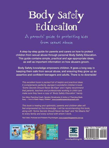 'Body Safety Education - A parents' guide to protecting kids from sexual abuse' is a step-by-step guide for parents and carers on how to protect children from sexual abuse through personal Body Safety Education. This guide contains simple, practical and age-appropriate ideas, as well as important information on how abusers groom and signs a child maybe being sexually abused. Body Safety knowledge empowers children. It goes a long way in keeping them safe from sexual abuse, and ensuring they grow up as assertive and confident teenagers and adults. There is no downside! This book is an invaluable guide for parents, caregivers, teachers and healthcare professionals to not only learn the key steps when teaching Body Safety Education (also known as protective behaviours or child sexual abuse prevention education) but to also educate themselves in the signs a child is being sexually abused, what to do if a child bravely discloses, how a predator grooms both the family and the child, valuable organizations and links, etc. In fact, 95% of sexually abused children will know their abuser and only 5% will be strangers. As noted 'stranger danger' is not really the issue. Pedophiles and child sex abusers are in our homes and in our families. Part of Body safety Education is teaching children that they must never keep secrets that make them feel bad or uncomfortable (in fact, we teach it's best not to have secrets in families, only happy surprises). The trouble with secrets is that they are the main tool used by child molesters to ensure children remain silent about the abuse. Ensuring the secret is kept is of utmost importance to the perpetrator. Therefore, threats and insisting no-one will believe the child is used as a way of controlling the child to be silent. Through Body Safety Education parents and children will learn the importance of there being no secrets between us. Parents and carers need to be on the lookout for signs of sexual abuse in children and grooming behaviour which is often focused on themselves as well as their children. The answer to the question, 'How do I keep kids safe from sexual abuse?' is simple; teach them Body Safety Education from a very young age. Always use the correct names for their genitals, ensure they know that the parts covered by their swimsuit are known as their private parts, and that private means 'just for you', and consequently not for sharing. This is known as the swimsuit lesson. When you teach your child that 'your body belongs to you' you are empowering them with confidence through knowledge. Body Safety Education also involves teaching your child that no-one can touch their private parts, and if they do, they must tell a trusted adult until believed. Kids need to be safe as well as feel safe. Teaching a child that private means 'just for you' and that their private parts are found under their swimsuit is a valuable lesson that can prevent child molestation. The sexual abuse of children is regrettably very common. Approximately 1 in 3 girls and 1 in 6 boys will be sexually abused before their 18th birthday. You can help stop child abuse by teaching social and physical boundaries to kids and that some parts are not for sharing. A child needs be able to proclaim loudly and with conviction that, 'My body belongs to me', 'I am the boss of my body' and that 'From my head to my toes, I say what goes'. Please note: the author uses 'safe and unsafe touch' or 'inappropriate touch' as preferred terms for good and bad touch which may be confusing for a child as bad touch (inappropriate touch) can often feel good, i.e. be pleasurable and this can cause confusion for a child.