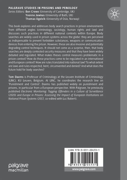 Chapter 1. Body searches as contested control measures.- Chapter 2. The imposition of power through touch: A sensory criminology approach to understanding body searches.- Chapter 3. Searching, 'state of security' and the structuration of prison security.- Chapter 4. Strip searches: A risky practice that needs to be monitored.- Chapter 5. Strip searches through the lens of the prohibition of inhuman and degrading treatment in European human rights law.- Chapter 6. Body searches and vulnerable groups: Women and LGBTQI+ people in prison.- Chapter 7. Body searches in Belgian prisons: dignity, security and denial.- Chapter 8. Body searches in French prisons: Dignity and security on a roller coaster.- Chapter 9. Stripping the self away: security, control, and punishment in the practice of strip searches in Spanish prisons.- Chapter 10. Gendered punishment and protest in a context of conflict: Strip searching in Northern Ireland.- Chapter 11. "There's a tech for that": balancing dignity and security in carceral settings through alternative technology devices.- Chapter 12. What future for body searches in prisons?.