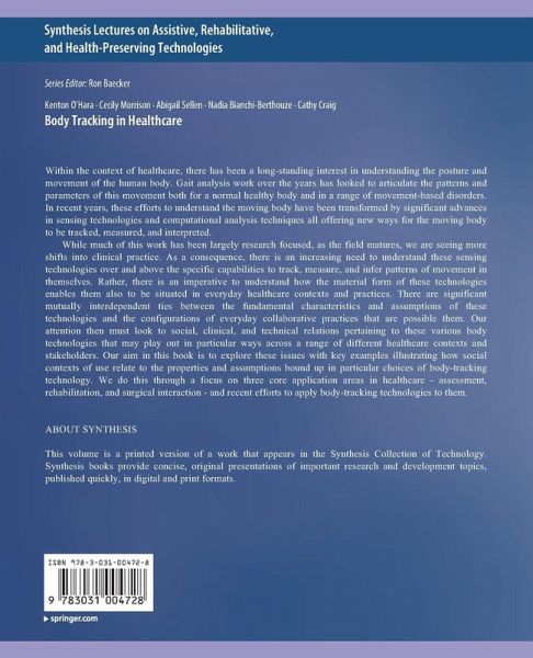 Within the context of healthcare, there has been a long-standing interest in understanding the posture and movement of the human body. Gait analysis work over the years has looked to articulate the patterns and parameters of this movement both for a normal healthy body and in a range of movement-based disorders. In recent years, these efforts to understand the moving body have been transformed by significant advances in sensing technologies and computational analysis techniques all offering new ways for the moving body to be tracked, measured, and interpreted. While much of this work has been largely research focused, as the field matures, we are seeing more shifts into clinical practice. As a consequence, there is an increasing need to understand these sensing technologies over and above the specific capabilities to track, measure, and infer patterns of movement in themselves. Rather, there is an imperative to understand how the material form of these technologies enables them also tobe situated in everyday healthcare contexts and practices. There are significant mutually interdependent ties between the fundamental characteristics and assumptions of these technologies and the configurations of everyday collaborative practices that are possible them. Our attention then must look to social, clinical, and technical relations pertaining to these various body technologies that may play out in particular ways across a range of different healthcare contexts and stakeholders. Our aim in this book is to explore these issues with key examples illustrating how social contexts of use relate to the properties and assumptions bound up in particular choices of body-tracking technology. We do this through a focus on three core application areas in healthcare-assessment, rehabilitation, and surgical interaction-and recent efforts to apply body-tracking technologies to them.