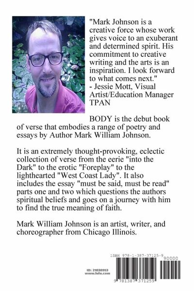 ""BODY"" is a book of poetry and poetic writing by first-time author Mark William Johnson from Chicago Il. BODY includes a range of emotions from eerie ""Into the Dark"" to erotic ""Foreplay"" to lighthearted ""West Coast Lady"" It also includes the essay ""must be said,must be read"" parts one and two that challenges the author through his spiritual journey and in search of the true meaning of faith.