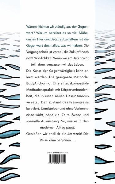 Warum flüchten wir ständig aus der Gegenwart? Warum bereitet es so viel Mühe, uns im Hier und Jetzt aufzuhalten? Ist die Gegenwart doch alles, was wir haben: Die Vergangenheit ist vorbei, die Zukunft noch nicht Wirklichkeit. Wenn wir am Jetzt nicht teilhaben, verpassen wir das Leben. Die Kunst der Gegenwärtigkeit kann erlernt werden. Die geeignete Methode: BodyAnchoring. Eine alltagskompatible Meditationspraktik mit Körperverbundenheit, die in einen neuen Daseinsmodus versetzt. Den Zustand des Präsentseins kultiviert. Unmittelbar und ohne Vorkenntnisse wirkt, ohne viel Zeitaufwand und spezielle Ausrüstung. So, wie es in den modernen Alltag passt. Genießen wir endlich die Jetztzeit! Die Reise kann beginnen ...