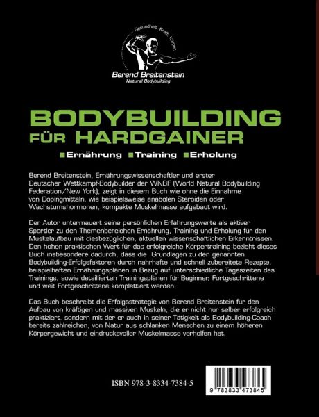 BODYBUILDING FÜR HARDGAINER Ernährung. Training. Erholung.Berend Breitenstein, Ernährungswissenschaftler und erster Deutscher Wettkampf- Bodybuilder der WNBF (World Natural Bodybuilding Federation / New York), zeigt in diesem Buch wie ohne die Einnahme von Dopingmitteln, wie beispielsweise anabolen Steroiden oder Wachstumshormonen, kompakte Muskelmasse aufgebaut wird. Der Autor untermauert seine persönlichen Erfahrungswerte als aktiver Sportler zu den Themenbereichen Ernährung, Training und Erholung für den Muskelaufbau mit diesbezüglichen, aktuellen wissenschaftlichen Erkenntnissen. Den hohen praktischen Wert für das erfolgreiche Körpertraining bezieht dieses Buch insbesondere dadurch, dass die Grundlagen zu den genannten Bodybuilding-Erfolgsfaktoren durch nahrhafte und schnell zubereitete Rezepte, beispielhaften Ernährungsplänen in Bezug auf unterschiedliche Tageszeiten des Trainings, sowie detaillierten Trainingsplänen für Beginner, Fortgeschrittene und weit Fortgeschrittene komplettiert werden. Das Buch beschreibt die Erfolgsstrategie von Berend Breitenstein für den Aufbau von kräftigen und massiven Muskeln, die er nicht nur selber erfolgreich praktiziert, sondern mit der er auch in seiner Tätigkeit als Bodybuilding-Coach bereits zahlreichen, von Natur aus schlanken Menschen zu einem höheren Körpergewicht und eindruckvoller Muskelmasse verholfen hat.