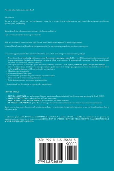 Vuoi aumentare la tua massa muscolare? Semplice no? "Iscriviti in palestra e allenati con i pesi regolarmente e vedrai che in un paio di mesi, guadagnerai così tanti muscoli che sarai pronto per affrontare qualsiasi gara di bodybuilding." Questo è quello che solitamente viene raccontato a chi ha questo obiettivo. Ma è davvero così semplice metter su peso e muscoli? Bene, per aumentare la massa muscolare, sappi che non ti basterà solo andare in palestra ed allenarti regolarmente. In questo libro affronterò nel dettaglio tutti gli aspetti specifici che entrano in gioco quando si tratta di metter su muscoli. Ecco alcuni suggerimenti utili che saranno approfonditi nel testo e che ti serviranno per massimizzare i tuoi guadagni:Prima di tutto dovrai bruciare i grassi in eccesso e poi dopo pensare a guadagnare muscoli. Non è così difficile come potresti pensare, ma non sarà nemmeno facilissimo. Potrai allenare il tuo corpo a bruciare le calorie in eccesso invece di immagazzinarle come grasso e poi dopo potrai allenarti seriamente per aumentare la tua massa muscolare. Con le giuste tecniche ce la farai! Per questo motivo, in questo libro ti mostrerò i modi migliori per bruciare grasso e per costruire i muscoli. Ci sono molti aspetti da considerare per capire precisamente quanto tempo ti ci vorrà per guadagnare nuova massa muscolare. Essi dipendono da molte variabili in gioco che nel libro approfondirò una dopo l'altra. Chiediti come stai mangiando. Stai assumendo abbastanza calorie? Stai assumendo i giusti nutrienti per accelerare la crescita muscolare? Ti stai allenando correttamente e regolarmente? Hai la giusta genetica per una costante crescita muscolare …e dulcis in fundo una chicca in più per approfondire meglio il tutto: 4 BONUS EXTRA:PIANO ALIMENTARE con tabelle pronte all'uso per massimizzare I tuoi risultati sulla base del tuo gruppo sanguigno (A, B, AB, ZERO); LISTA INTERATTIVA dei migliori prodotti sul fitness testati da me; PERCORSO DI CONSULENZA DIRETTA per diventare un caso studio di successo. LE BASI DELL'IPERTROFIA: quello che devi sapere per massimizzare i tuoi allenamenti e per ottenere massa muscolare rapidamente. Questi sono tutti argomenti che saranno affrontati uno dopo l'altro e a cui dovrai prestare particolare attenzione se non vorrai vanificare i tuoi sforzi in palestra e a tavola. Ti offro una guida CONCENTRATA, ESTREMAMENTE PRATICA e SENZA INUTILI TEORIE per semplificare il tuo percorso nel raggiungimento dei risultati che ti ho promesso ANCHE SE NON CI CAPISCI NIENTE DI ALLENAMENTO E ALIMENTAZIONE, E ANCHE SE SEI SOLO UN NEOFITA. Se anche tu vuoi imparare come allenarti e mangiare efficacemente per incrementare la tua massa muscolare, e per mantenere un'ottima forma (con bassa percentuale di grasso corporeo) per tutto l'anno, SCORRI VERSO L'ALTO QUESTA PAGINA E CLICCA SUL PULSANTE ACQUISTA ORA!