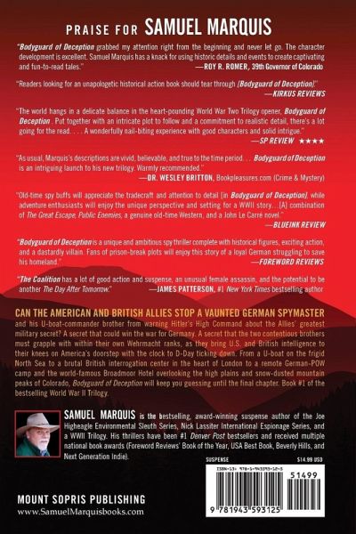BODYGUARD OF DECEPTION: A NOVEL OF SUSPENSE VOLUME ONE OF THE WORLD WAR TWO TRILOGY By Samuel Marquis #1 Denver Post Bestselling, Award-Winning Author Praise for Bodyguard of Deception "Bodyguard of Deception grabbed my attention right from the beginning and never let go. The character development is excellent. Samuel Marquis has a knack for using historic details and events to create captivating and fun to read tales."--Roy R. Romer, 39th Governor of Colorado "Readers looking for an unapologetic historical action book should tear through this volume." -- Kirkus Reviews "Old-time spy buffs will appreciate the tradecraft and attention to detail, while adventure enthusiasts will enjoy the unique perspective and setting for a WWII story. As Marquis throws in everything but the kitchen sink, he turns this well-told, if byzantine adventure novel into a combination of The Great Escape, Public Enemies, a genuine old-time Western, and a John Le Carré novel."--Blueink Review "The world hangs in a delicate balance in the heart-pounding World War Two Trilogy opener, Bodyguard of Deception by Samuel Marquis. Put together with an intricate plot to follow and a commitment to realistic detail, there's a lot going for the read...a wonderfully nail-biting experience with good characters and solid intrigue." --SP Review - Four-Star Review "As usual, Marquis's descriptions are vivid, believable, and true to the time period...Bodyguard of Deception is an intriguing launch to his new trilogy."--Dr. Wesley Britton, Bookpleasures.com (Crime & Mystery) "Bodyguard of Deception is a unique and ambitious spy thriller complete with historical figures, exciting action, and a dastardly villain. Fans of prisonbreak plots will enjoy this story of a loyal German struggling to save his homeland."--Foreword Reviews "A fast-paced, riveting WWII espionage thriller. Bodyguard of Deception is as good as the best of Daniel Silva, Ken Follett, Alan Furst, and David Baldacci and brings back fond memories of the classic movie The Great Escape and Silva's finest novel, The Unlikely Spy."--Fred Taylor, President/Co-Founder Northstar Investment Advisors and Espionage Novel Aficionado Can the American and British Allies stop a vaunted German spymaster and his U-boat-commander brother from warning Hitler's High Command about the Allies' greatest military secret? It is a secret that could win the war for Germany--or, at the very least, delay the outcome for years with an inestimable cost in bloodshed, physical destruction, and suffering. And it is a secret that the two contentious brothers must grapple with within their own Wehrmacht ranks, as they bring U.S. and British intelligence to their knees on America's doorstep with the clock to D-Day ticking down. From a U-boat on the frigid North Sea to a brutal British interrogation center in heart of London to a remote German-POW camp and the world-famous Broadmoor Hotel overlooking the high plains and snow-dusted mountain peaks of Colorado, Bodyguard of Deception will keep you guessing until the final chapter. The first book of #1 Denver Post Bestselling, Award-Winning Suspense Author Samuel Marquis's World War II Trilogy.