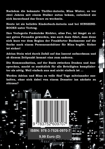 Nachdem die bekannte Thriller-Autorin, Mina Winter, es vor zwei Jahren mit einem Stalker zu tun bekam, entschied sie sich kurzerhand das Genre zu wechseln.Heute ist sie beliebte Kinderbuch-Autorin und bei SUNSHINE-BOOKS unter Vertrag. Ihre Verlegerin Fredericke Richter, alias Fee, ist längst zu einer guten Freundin geworden, was auch dazu führt, dass diese sich kurz vor dem Beginn der Frankfurter Buchmesse auf die Suche nach einem Personenschützer für Mina begibt. Sicher ist sicher! Adrian Stein wird durch Zufall auf das Inserat aufmerksam und ab diesem Zeitpunkt kommt eins zum anderen. Die Kommunikation, auf der Basis zwischen Denken und Aussprechen, macht es zusätzlich für alle Beteiligten komplizierter als nötig. Weil einfach nun mal nicht einfach ist ...Werden Adrian und Mina es volle fünf Tage miteinander aushalten, ohne sich dabei von einem Desaster ins nächste zu stürzen?