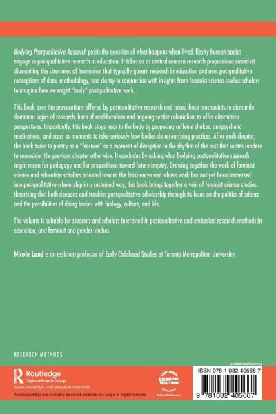 This book uses the provocations offered by postqualitative research and takes these touchpoints to dismantle dominant logics of research, born of neoliberalism and ongoing settler colonialism to offer alternative perspectives. Importantly, this book stays near to the body by proposing caffeine shakes, antipsychotic medications, and scars as moments to take seriously how bodies do researching practices. After each chapter, the book turns to poetry as a "fracture" or a moment of disruption tothe rhythm of the text that incites readers to reconsider the previous chapter otherwise. It concludes by asking what bodying postqualitative research might mean for pedagogy and for propositions toward future inquiry. Drawing together the work of feminist science and education scholars oriented toward the biosciences and whose work has not yet been immersed into postqualitative scholarship in a sustained way, this book brings together a vein of feminist science studies theorizing that both deepens and troubles postqualitative scholarship through its focus on the politics of science and the possibilities of doing bodies with biology, culture, and life.