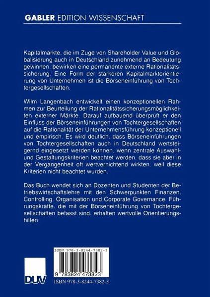 Wilm Langenbach entwickelt einen konzeptionellen Rahmen zur Beurteilung der Rationalitätssicherungsmöglichkeiten externer Märkte. Darauf aufbauend überprüft er den Einfluss der Börseneinführungen von Tochtergesellschaften auf die Rationalität der Unternehmensführung konzeptionell und empirisch. Es wird deutlich, dass Börseneinführungen von Tochtergesellschaften auch in Deutschland wertsteigernd eingesetzt werden können, wenn zentrale Auswahl- und Gestaltungskriterien beachtet werden, dass sie aber in der Vergangenheit oft wertvernichtend wirkten, weil diese Kriterien nicht beachtet wurden.