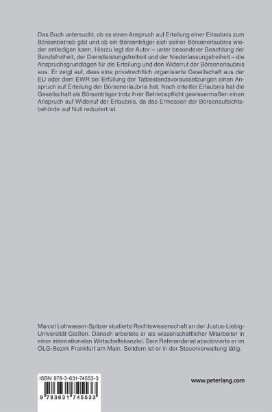 Das Buch untersucht, ob es einen Anspruch auf Erteilung einer Erlaubnis zum Börsenbetrieb gibt und ob ein Börsenträger sich seiner Börsenerlaubnis wieder entledigen kann. Hierzu legt der Autor - unter besonderer Beachtung der Berufsfreiheit, der Dienstleistungsfreiheit und der Niederlassungsfreiheit - die Anspruchsgrundlagen für die Erteilung und den Widerruf der Börsenerlaubnis dar. Er zeigt auf, dass eine privatrechtlich organisierte Gesellschaft aus der EU oder dem EWR bei Erfüllung der Tatbestandsvoraussetzungen einen Anspruch auf Erteilung der Börsenerlaubnis hat. Nach erteilter Erlaubnis hat die Gesellschaft als Börsenträger trotz ihrer Betriebspflicht gewissermaßen einen Anspruch auf Widerruf der Erlaubnis, da das Ermessen der Börsenaufsichtsbehörde auf Null reduziert ist.