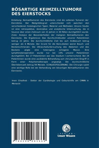 Einleitung: Keimzelltumoren des Eierstocks sind die seltenen Tumoren der Eierstöcke. Der Malignitätsgrad unterscheidet sich zwischen den verschiedenen histologischen Typen. Material und Methoden: Unsere Studie ist eine retrospektive, deskriptive und analytische Untersuchung, die in Sousse über einen Zeitraum von 21 Jahren in 30 Fällen durchgeführt wurde. Ziele: Analyse der Besonderheiten der malignen Keimzelltumoren des Eierstocks. Die Ergebnisse: Das Durchschnittsalter unserer Patientinnen betrug 22 Jahre. Die durchschnittliche Zeit bis zum Arztbesuch betrug weniger als 6 Monate. Der Grund für die Konsultation waren Bauch- und Beckenschmerzen. Die Ultraschalluntersuchung des Abdomen und des Beckens zeigte eine heterogene echogene Masse. Eine Lymphknotenoperation wurde nur bei 10% unserer Patientinnen durchgeführt. Bei 17 Patientinnen war das Stadium I vorherrschend. Bei 24 Patientinnen wurde eine zusätzliche Behandlung zum chirurgischen Eingriff in Form einer Polychemotherapie angezeigt. Die durchschnittliche Überlebenszeit betrug 94 Monate. SCHLUSSFOLGERUNG: Die Chirurgie spielt eine wichtige Rolle bei der Behandlung von bösartigen Keimzelltumoren des Eierstocks.