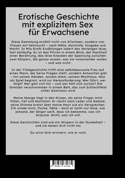 Diese Sammlung erzählt nicht von Klischees, sondern von Frauen mit Sehnsucht - nach Nähe, Kontrolle, Hingabe und Macht. In Mia Grafs Erzählungen lodert das Verlangen leise, fast beiläufig. Es ist das Flirren in einem Blick, der Nachhall einer Berührung, das leise Knacken der Spannung zwischen zwei Körpern, die genau wissen, was sie voneinander wollen - und was nicht.In der Titelgeschichte trifft eine selbstbewusste Frau auf einen Mann, der keine Fragen stellt, sondern Antworten gibt - mit seinen Händen, seinem Atem, seinem Rhythmus. Was als Spiel beginnt, wird zur Herausforderung: Wer führt, wer folgt? Wer gibt sich hin - und wer hält sich zurück? Die Grenzen verschwimmen in einem Bett, das zum Schlachtfeld stiller Dominanz wird.Meine Wange liegt in den Kissen, als seine Finger mich füllen, tief und bestimmt. Er riecht nach Leder und Geduld, seine Stimme kratzt über meine Haut wie ein Versprechen. Ich winde mich, fluche, flehe - doch er lacht nur leise, wie jemand, der längst weiß, dass ich bekomme, was ich brauche. Nicht, was ich will.Diese Geschichten sind wie ein Wispern in der Dunkelheit - und sie lassen dich nicht los.Du wirst dich erinnern, wie er roch.