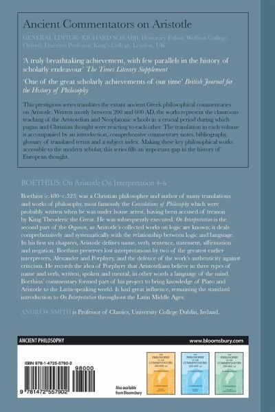 Boethius (c. 480-c. 525) was a Christian philosopher and author of many translations and works of philosophy, most famously the Consolations of Philosophy which were probably written when he was under house arrest, having been accused of treason by King Theoderic the Great. He was subsequently executed. On Interpretation is the second part of the Organon , as Aristotle's collected works on logic are known; it deals comprehensively and systematically with the relationship between logic and language. In his first six chapters, Aristotle defines name, verb, sentence, statement, affirmation and negation. Boethius preserves lost interpretations by two of the greatest earlier interpreters, Alexander and Porphyry, and the defence of the work's authenticity against criticism. He records the idea of Porphyry that Aristotelians believe in three types of name and verb, written, spoken and mental, in other words a language of the mind. Boethius' commentary formed part of his project to bring knowledge of Plato and Aristotle to the Latin-speaking world. It had great influence, remaining the standard introduction to On Interpretation throughout the Latin Middle Ages.