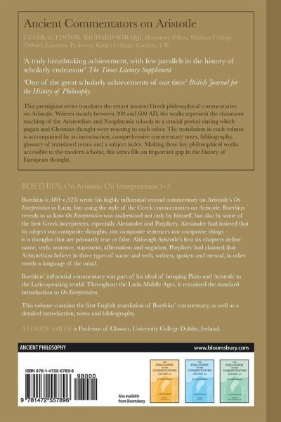 Boethius (c.480-c.525) wrote his highly influential second commentary on Aristotle's On Interpretation in Latin, but using the style of the Greek commentaries on Aristotle. It was part of his project to bring knowledge of Plato and Aristotle to the Latin-speaking world of his fellow Christians. The project was cruelly interrupted by his execution at the age of about 45, leaving the Latin world under-informed about Greek Philosophy for 700 years. Boethius reveals to us how On Interpretation was understood not only by himself, but also by some of the best Greek interpreters, especially Alexander and Porphyry. Alexander had insisted that its subject was composite thoughts, not composite sentences nor composite things - it is thoughts that are primarily true or false. Although Aristotle's first six chapters define name, verb, sentence, statement, affirmation and negation, Porphyry had claimed that Aristotelians believe in three types of name and verb, written, spoken and mental, in other words a language of the mind. Boethius discusses individuality and ascribes to Aristotle a view that each individual is distinguished by having a composite quality that is not merely unshared, but unshareable. Boethius also discusses why we can still say that the dead Homer is a poet, despite having forbidden us to say that the dead Socrates is either sick or well. But Boethius' most famous contribution is his interpretation of Aristotle's discussion of the threat of that tomorrow's events, for example a sea battle, will have been irrevocable 10,000 years ago, if it was true 10,000 years ago that there would be a sea battle on that day. In Boethius' later Consolation of Philosophy, written in prison awaiting execution, he offered a seminal conception of eternity to solve the related problem of future events being irrevocable because of God's foreknowledge of them. Boethius' influential commentary was part of his ideal of bringing Plato and Aristotle to the Latin-speaking world. Throughout the Latin Middle Ages, it remained the standard introduction to On Interpretation. This volume contains the first English translation of Boethius' commentary, as well as a detailed introduction, notes and bibliography.