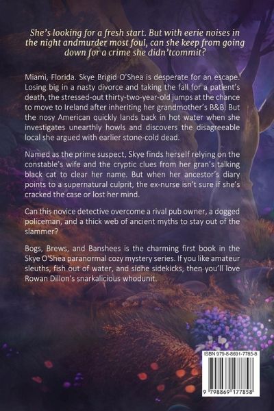 She's looking for a fresh start. But with eerie noises in the night and murder most foul, can she keep from going down for a crime she didn't commit? Miami, Florida. Skye Brigid O'Shea is desperate for an escape. Losing big in a nasty divorce and taking the fall for a patient's death, the stressed-out thirty-two-year-old jumps at the chance to move to Ireland after inheriting her grandmother's B&B. But the nosy American quickly lands back in hot water when she investigates unearthly howls and discovers the disagreeable local she argued with earlier stone-cold dead. Named as the prime suspect, Skye finds herself relying on the constable's wife and the cryptic clues from her gran's talking black cat to clear her name. But when her ancestor's diary points to a supernatural culprit, the ex-nurse isn't sure if she's cracked the case or lost her mind. Can this novice detective overcome a rival pub owner, a dogged policeman, and a thick web of ancient myths to stay out of the slammer? Bogs, Brews, and Banshees is the charming first book in the Skye O'Shea paranormal cozy mystery series. If you like amateur sleuths, fish out of water, and sídhe sidekicks, then you'll love Rowan Dillon's snarkalicious whodunit. Buy Bogs, Brews, and Banshees to peek behind the veil today!