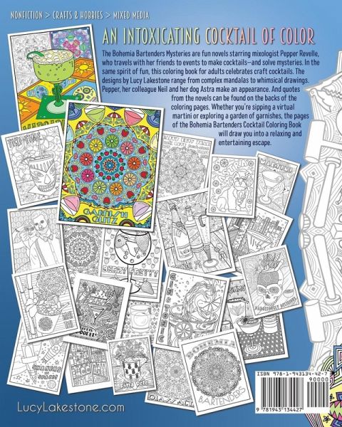An intoxicating cocktail of color! The Bohemia Bartenders Mysteries are fun novels starring mixologist Pepper Revelle, who travels with her friends to events to make cocktails-and solve mysteries. In the same spirit of fun, this coloring book for adults celebrates craft cocktails. The designs by Lucy Lakestone range from complex mandalas to whimsical drawings. Pepper, her colleague Neil and her dog Astra make an appearance. And quotes from the novels can be found on the backs of the coloring pages. Whether you're sipping a virtual martini or exploring a garden of garnishes, the pages of the Bohemia Bartenders Cocktail Coloring Book will draw you into a relaxing and entertaining escape.