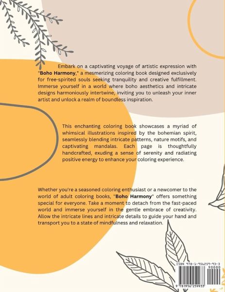 Embark on a captivating voyage of artistic expression with "Boho Harmony," a mesmerizing coloring book designed exclusively for free-spirited souls seeking tranquility and creative fulfillment. Immerse yourself in a world where boho aesthetics and intricate designs harmoniously intertwine, inviting you to unleash your inner artist and unlock a realm of boundless inspiration. This enchanting coloring book showcases a myriad of whimsical illustrations inspired by the bohemian spirit, seamlessly blending intricate patterns, nature motifs, and captivating mandalas. Each page is thoughtfully handcrafted, exuding a sense of serenity and radiating positive energy to enhance your coloring experience. Whether you're a seasoned coloring enthusiast or a newcomer to the world of adult coloring books, "Boho Harmony" offers something special for everyone. Take a moment to detach from the fast-paced world and immerse yourself in the gentle embrace of creativity. Allow the intricate lines and intricate details to guide your hand and transport you to a state of mindfulness and relaxation. Features: * Includes 52 professional coloring book designs 1. Boho Abstract Landscape Coloring Pages 2. Boho Autumn Landscape Coloring Pages 3. Boho Summer Landscape Coloring Pages 4. Boho Magical Landscape Coloring Pages 5. Window Botanical Coloring Sheets 6. Botanical Coloring Pages And much more! * All pages are single-sided to prevent bleed-through (when using markers, pastels or watercolors) * Large 8.5x11inch pages on high-quality paper * Hours of fun and relaxation! Get your copy today!