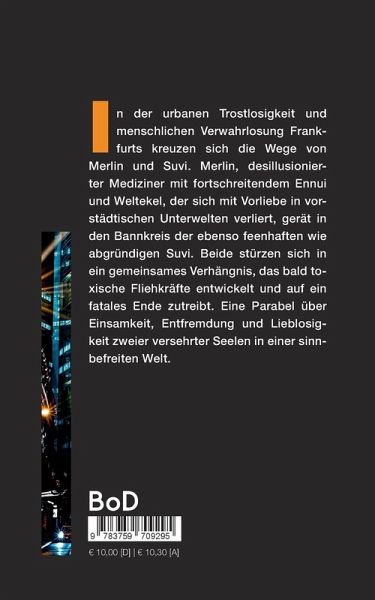 In der urbanen Trostlosigkeit und menschlichen Verwahrlosung Frankfurts kreuzen sich die Wege von Merlin und Suvi. Merlin, desillusionierter Mediziner mit fortschreitendem Ennui und Weltekel, der sich mit Vorliebe in vorstädtischen Unterwelten verliert, gerät in den Bannkreis der ebenso feenhaften wie abgründigen Suvi. Beide stürzen sich in ein gemeinsames Verhängnis, das bald toxische Fliehkräfte entwickelt und auf ein fatales Ende zutreibt. Eine Parabel über Einsamkeit, Entfremdung und Lieblosigkeit zweier versehrter Seelen in einer sinnbefreiten Welt.