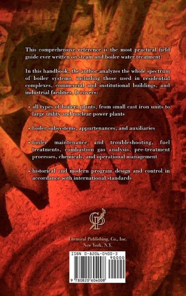 BOILER WATER TREATMENT, PRINCIPLES AND PRACTICE VOLUME 2 of Two Volumes by COLIN FRAYNE. Vol. II: Treatments, Program Design, and Management, ISBN:0-8206-0400-3 This comprehensive reference is the most practical field guide ever written on steam and boiler water treatment. In this two-volume handbook, Colin Frayne (Cooling Water Treatment, Principles and Practice, also by Chemical Publishing) analyzes the whole spectrum of boiler systems, including those used in residential complexes, commercial and institutional buildings, and industrial facilities. The breadth of the book covers: All types of boilers plants, from small cast iron units to large utility and nuclear power plants. Boiler subsystems, appurtenances, and auxiliaries Boiler maintenance and troubleshooting, fuel treatments, combustion gas analysis, pre-treatment processes, chemicals, and operational management Historical and modern program design and control in accordance with international standards Introduction; The Function of Boiler Water; Treatment and Its Marketing Steam Generation; Boiler Types and Applications; Boiler Plant Subsystems, Appurtenances, and Auxiliaries; Waterside and Steamside Problems: The Basics; Waterside and Steamside Problems: Hot Water Heating and Low-Pressure Steam Boiler; Waterside and Steamside Problems: Pre-Boiler Section Specifics; Waterside and Steamside Problems: Boiler Section Specifics; Waterside and Steamside Problems: Post-Boiler Section Specifics; Pre-Boiler and Post-Boiler Treatment Processes; Internal Treatment Programs; Adjuncts and Conjuctional Treatments; Control of Boiler Water Chemistry; Operational Control of Waterside Surfaces; Control of Fireside Conditions and Surfaces. Appendix I Useful Data; Appendix II Glossary; Bibliography. Index. This book is Volume 2 of a 2 Volume set. Other titles by author Colin Frayne: Cooling Water Treatment: Principles and Practice ISBN 978-0-8206-0370-4; Cooling Water Treatment Principles and Practices: Charts and Notes For Field Use ISBN 978-0-8206-0003-1
