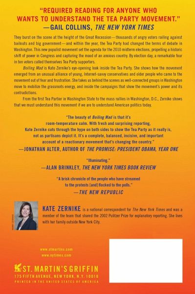 "Concise [and] elegantly written. . . . A convincing portrait of the movement's most ardent activists."-Los Angeles Times They burst on the scene at the height of the Great Recession-thousands of angry voters railing against bailouts and big government-and within the year, the Tea Party had changed the terms of debate in Washington. This new populist movement set the agenda for the 2010 midterm elections, propelling a historic shift of power in Congress and capturing the mood of an anxious country. By election day, a remarkable four in ten voters called themselves Tea Party supporters. Boiling Mad is Kate Zernike's eye-opening look inside the Tea Party, introducing us to its cast of unlikely activists and the philosophy and zeal that animate them. She shows how the movement emerged from an unusual alliance of young, Internet-savvy conservatives and older people who came to the movement out of fear and frustration. She takes us behind the scenes as well-connected groups in Washington move to mobilize the grassroots energy, and inside the campaign that best showed the movement's power and its contradictions. Putting the Tea Party in the context of other conservative revolts, Zernike shows us how the movement reflects important philosophical and cultural strains that have long been a feature of American politics.