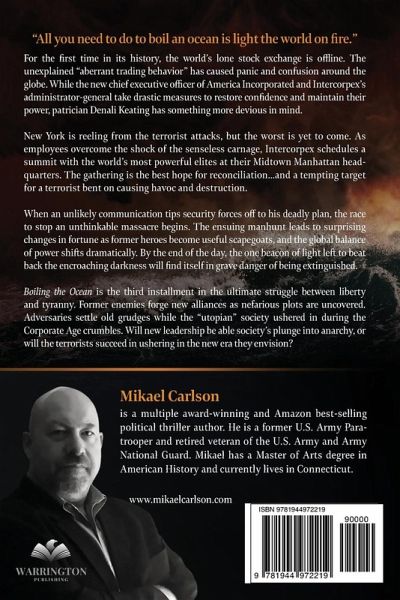 All you need to do to boil an ocean is set the world on fire. In a retelling of his Orwellian 2015 Black Swan Saga, award-winning author Mikael Carlson reintroduces a speculative fiction saga showing the world's terrifying dystopian future. Boiling the Ocean is the third novel in a planned six-book serial drama. Readers are strongly encouraged to begin the journey with this The Black Swan Event and enjoy the America, Inc. Saga in the order they were written. The America, Inc. Saga follows a global economic collapse in 2039 that brought governments to their knees and chaos across the globe. To fill the power vacuum, giant multinational corporations, backed by wealthy benefactors, seized the reins of power and began governing the masses. Nearly fifty years later, there is no crime, no unemployment, no homelessness, and no war. All that progress came at a price - individual freedom.The end was only the beginning... For the first time in its history, the world's lone stock exchange is offline. The unexplained "aberrant trading behavior" has caused panic and confusion around the globe. While the new chief executive officer of America Incorporated and Intercorpex's administrator-general take drastic measures to restore confidence and maintain their power, patrician Denali Keating has something more devious in mind. New York is reeling from the terrorist attacks, but the worst is yet to come. As employees overcome the shock of the senseless carnage, Intercorpex schedules a summit with the world's most powerful elites at their Midtown Manhattan headquarters. The gathering is the best hope for reconciliation...and a tempting target for a terrorist bent on causing havoc and destruction. When an unlikely communication tips security forces off to his deadly plan, the race to stop an unthinkable massacre begins. The ensuing manhunt leads to surprising changes in fortune as former heroes become useful scapegoats, and the global balance of power shifts dramatically. By the end of the day, the one beacon of light left to beat back the encroaching darkness will find itself in grave danger of being extinguished. Born from the ashes left by the collapse of world governments in 2039, the world in 2088 is eerily similar to the present - filled with surveillance, propaganda, greed, and opportunism. The America, Inc. Saga is the next great struggle between liberty and tyranny. Loyalties are shifting, and alliances are fracturing. Political bickering threatens to undo the "utopian" corporatist society. Can differences be set aside, or will bounded rationality allow the "terrorists" to move closer to implementing a new world order? Continue your journey in this epic saga and buy a copy of Boiling the Ocean today! The America, Inc. Saga (in order): The Black Swan Event Bounded Rationality Boiling the Ocean