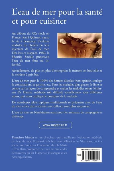Contenu Le livre explique, avec plus de 60 illustrations, comment utiliser l'eau de mer pour la santé et pour cuisiner. De nombreux plats typiques traditionnels se préparent avec de l'eau de mer, et les plats cuisinés avec celle-ci, sont plus savoureux. Les vertus médicinales des eaux salées sont connues depuis des temps immémoriaux. Plus récemment, au début du XXe siècle en France, beaucoup d'enfants mouraient du choléra. René Quinton leur sauva la vie en leur injectant de l'eau de mer. Dès lors et jusqu'en 1980, la Sécurité Sociale prescrivait l'eau de mer (bue ou injectée). L'eau de mer est un remède naturel pour les hernies discales (non opérés), maladies rénales, soulage la constipation, la gastrite, etc. Pour les maladies plus graves (cancers, coeur, etc.), le livre se centre sur la façon de comprendre et traiter les maladies selon l'éminent Docteur Hamer, méthode très diffusée actuellement sous différents noms, qui nous explique le pourquoi de la maladie et la compréhension correcte de la situation. Avec cette compréhension nous allons au delà des recettes, à un dosage de l'eau de mer géré par nous mêmes. Les substances toxiques présentes dans l'environnement ou bien notre hérédité ont de l'influence, mais ce qui est décisif, ce sont les chocs émotionnels que nous avons vécu. Les découvertes du Dr Hamer nous expliquent quel est le choc qui origine chaque maladie et de cette façon nous pouvons le résoudre et ne plus y retomber. Le livre donne aussi une introduction sur ce sujet. Actuellement, le Nicaragua est le pays où l'utilisation médicale de l'eau de mer est la plus étendue. En France, USA, et Canada, de plus en plus d'entreprises la mettent en bouteille et la vendent à prix bas. Le livre explique la façon de l'utiliser quotidiennement:pour les petits maux, pour préparer des recettes de cuisine, ou des boissons pour les sportifs; et comment l'utiliser lorsque nous sommes malades. L'eau de mer est bienfaisante aussi pour les animaux de compagnie et d'élevage. Sur le site web du livre vous pouvez voir les premiers chapitres. Format Ce livre est "Impression à la demande" (brochage collé, pas de rabats). Sur le site du livre vous trouverez une autre version (brochage cousu, rabats).