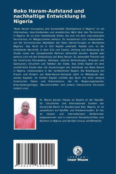 "Boko Haram Insurgency and Sustainable Development in Nigeria" ist ein informatives, beschreibendes und analytisches Werk über den Terrorismus in Nigeria. Es ist eine intellektuelle Arbeit, die sich mit dem internationalen Terrorismus im Weltgeschehen befasst. Es konzentriert sich insbesondere auf die terroristischen Aktivitäten der Boko Haram-Gruppe im Nordosten Nigerias. Das Buch ist in fünf Kapitel unterteilt. Kapitel eins ist der einleitende Abschnitt, in dem Ziel und Zweck, Umfang und Bedeutung der Studie sowie der konzeptionelle Rahmen behandelt werden. Kapitel zwei befasst sich mit der Entwicklung von Boko Haram. Es behandelt Themen wie die historische Perspektive, Ideologie, externe Verbindungen, Finanzen und Sponsoren, Ursachen und Taktiken der Sekte. Das dritte Kapitel ist eine ausführliche Studie über die Auswirkungen des Aufstands von Boko Haram in Nigeria, insbesondere in der nordöstlichen Region. Die Beteiligung von Frauen und Kindern am Boko-Haram-Aufstand steht imMittelpunkt des vierten Kapitels. Im fünften Kapitel schließt das Buch mit einer Analyse historischer Daten und Erkenntnisse, die für Regierungsbeamte, Entscheidungsträger, Wissenschaftler und andere interessierte Personen nützlich sind.