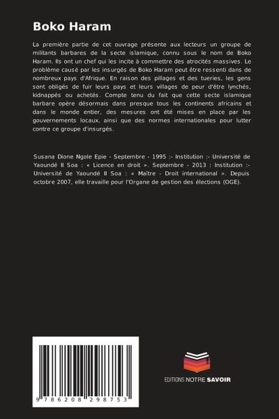 La première partie de cet ouvrage présente aux lecteurs un groupe de militants barbares de la secte islamique, connu sous le nom de Boko Haram. Ils ont un chef qui les incite à commettre des atrocités massives. Le problème causé par les insurgés de Boko Haram peut être ressenti dans de nombreux pays d'Afrique. En raison des pillages et des tueries, les gens sont obligés de fuir leurs pays et leurs villages de peur d'être lynchés, kidnappés ou achetés. Compte tenu du fait que cette secte islamique barbare opère désormais dans presque tous les continents africains et dans le monde entier, des mesures ont été mises en place par les gouvernements locaux, ainsi que des normes internationales pour lutter contre ce groupe d'insurgés.