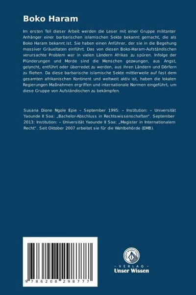 Im ersten Teil dieser Arbeit werden die Leser mit einer Gruppe militanter Anhänger einer barbarischen islamischen Sekte bekannt gemacht, die als Boko Haram bekannt ist. Sie haben einen Anführer, der sie in die Begehung massiver Gräueltaten einführt. Das von diesen Boko-Haram-Aufständischen verursachte Problem war in vielen Ländern Afrikas zu spüren. Infolge der Plünderungen und Morde sind die Menschen gezwungen, aus Angst, gelyncht, entführt oder überredet zu werden, aus ihren Ländern und Dörfern zu fliehen. Da diese barbarische islamische Sekte mittlerweile auf fast dem gesamten afrikanischen Kontinent und weltweit aktiv ist, haben die lokalen Regierungen Maßnahmen ergriffen und internationale Normen eingeführt, um diese Gruppe von Aufständischen zu bekämpfen.