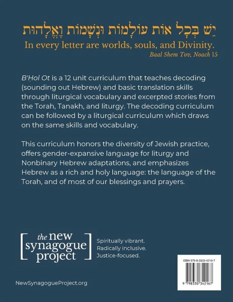 B'¿ol Ot is a 12 unit Hebrew curriculum that teaches decoding (sounding out Hebrew) and basic translation skills through liturgical vocabulary and excerpted stories from the Torah, Tanakh, and liturgy. The decoding curriculum can be followed by a liturgical curriculum which draws on the same skills and vocabulary. This curriculum honors the diversity of Jewish practice, offers gender-expansive language for liturgy and Nonbinary Hebrew adaptations, and emphasizes Hebrew as a rich and holy language: the language of the Torah, and of most of our blessings and prayers.