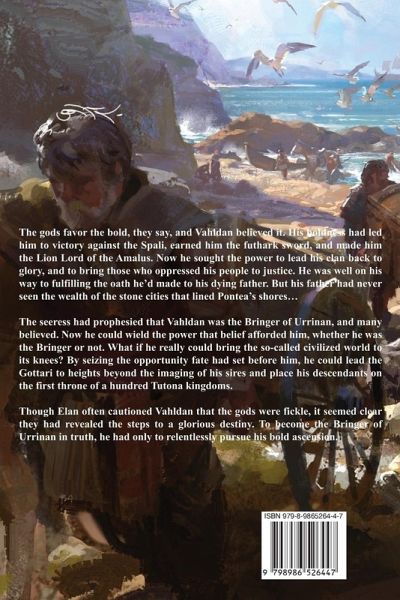 The gods favor the bold, they say, and Vahldan believed it. His boldness had led him to victory against the Spali, earned him the futhark sword, and made him the Lion Lord of the Amalus. Now he sought the power to lead his clan back to glory, and to bring those who oppressed his people to justice. He was well on his way to fulfilling the oath he'd made to his dying father. But his father had never seen the wealth of the stone cities that lined Pontea's shores... The seeress had prophesied that Vahldan was the Bringer of Urrinan, and many believed. Now he could wield the power that belief afforded him, whether he was the Bringer or not. What if he really could bring the so-called civilized world to its knees? By seizing the opportunity fate had set before him, he could lead the Gottari to heights beyond the imaging of his sires and place his descendants on the first throne of a hundred Tutona kingdoms. Though Elan often cautioned Vahldan that the gods were fickle, it seemed clear they had revealed the steps to a glorious destiny. To become the Bringer of Urrinan in truth, he had only to relentlessly pursue his bold ascension.