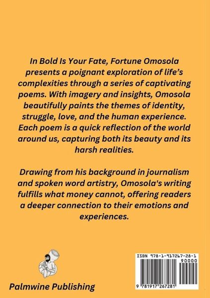 In Bold Is Your Fate, Fortune Omosola presents a poignant exploration of life's complexities through a series of captivating poems. With imagery and insights, Omosola beautifully paints the themes of identity, struggle, love, and the human experience. Each poem is a quick reflection of the world around us, capturing both its beauty and its harsh realities. Drawing from his background in journalism and spoken word artistry, Omosola's writing fulfills what money cannot, offering readers a deeper connection to their emotions and experiences.