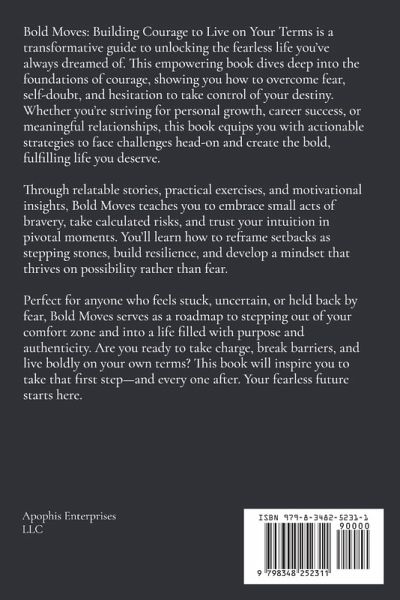Bold Moves: Building Courage to Live on Your Terms is a transformative guide to unlocking the fearless life you've always dreamed of. This empowering book dives deep into the foundations of courage, showing you how to overcome fear, self-doubt, and hesitation to take control of your destiny. Whether you're striving for personal growth, career success, or meaningful relationships, this book equips you with actionable strategies to face challenges head-on and create the bold, fulfilling life you deserve. Through relatable stories, practical exercises, and motivational insights, Bold Moves teaches you to embrace small acts of bravery, take calculated risks, and trust your intuition in pivotal moments. You'll learn how to reframe setbacks as stepping stones, build resilience, and develop a mindset that thrives on possibility rather than fear. Perfect for anyone who feels stuck, uncertain, or held back by fear, Bold Moves serves as a roadmap to stepping out of your comfort zone and into a life filled with purpose and authenticity. Are you ready to take charge, break barriers, and live boldly on your own terms? This book will inspire you to take that first step-and every one after. Your fearless future starts here.