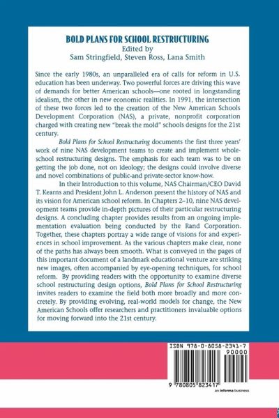 Contents: Acknowledgments. S. Stringfield S. Ross L. Smith Introduction: Bold Plans for School Restructuring: Nine Designs from New American Schools. D.T. Kearns J.L. Anderson Sharing the Vision: Creating New American Schools. A. Cohen J. Jordan The Audrey Cohen College System of Education(R): Purpose-Centered Education. C.J. Orrell ATLAS Communities: Authentic Teaching Learning and Assessment for All Students. B. Goldberg J. Richards The Co-NECT Design for School Change. M. Campbell E. Cousins G. Farrell M. Kamii D. Lam L. Rugen D. Udall The Expeditionary Learning Outward Bound Design. R. Heady S. Kilgore The Modern Red Schoolhouse. R. Rothman Reformat All Levels: National Alliance for Restructuring Education. R.E. Slavin N.A. Madden B.A. Wasik Roots and Wings: Universal Excellence in Elementary Education. W.B. Jennings Community Learning Centers. J. Johnson J. McDonald Los Angeles Learning Centers: An Initiative of Los Angeles Unified School District United Teachers Los Angeles and Los Angeles Educational Partnership. S. Bodilly Lessons Learned: RAND's Formative Assessment of NAS's Phase 2 Demonstration Effort. Appendix: Contact Information for New American Schools and the Design Teams.