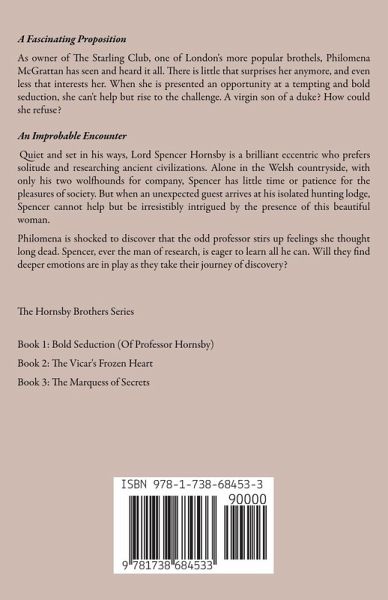 A Fascinating Proposition As the owner of The Starling Club, one of London's more popular brothels, Philomena McGrattan has seen and heard it all. There is little that surprises her anymore and even less that interests her. When she is presented with a tempting and bold seduction opportunity, she cannot help but rise to the challenge. A virgin son of a duke? How could she refuse? An Improbable Encounter Quiet and set in his ways, Lord Spencer Hornsby is a brilliant eccentric who prefers solitude and researching ancient civilizations. Alone in the Welsh countryside, with only his two wolfhounds for company, Spencer has little time or patience for the pleasures of society. But when an unexpected guest arrives at his isolated hunting lodge, Spencer cannot help but be irresistibly intrigued by the presence of this beautiful woman. Philomena is shocked to discover that the odd professor stirs up feelings she thought long dead. Spencer, ever the man of research, is eager to learn all he can. Will they find deeper emotions are in play as they take their journey of discovery?