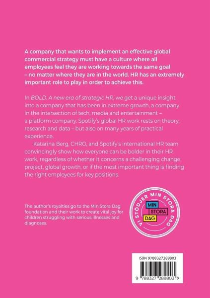 A company that wants to implement an effective global commercial strategy must have a culture where all employees feel they are working towards the same goal - no matter where they are in the world. HR has an extremely important role to play in order to achieve this. In BOLD: A new era of strategic HR, we get a unique insight into a company that has been in extreme growth, a company in the intersection of tech, media and entertainment - a platform company. Spotify's global HR work rests on theory, research and data - but also on many years of practical experience. Katarina Berg, CHRO, and Spotify's international HR team convincingly show how everyone can be bolder in their HR work, regardless of whether it concerns a challenging change project, global growth, or if the most important thing is finding the right employees for key positions. The author's royalties go to the Min Stora Dag foundation and their work to create vital joy for children struggling with serious illnesses and diagnoses.