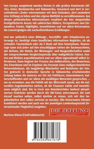 Wir haben Reisen nach Bolivien, Chile und Peru unternommen. Wir wollten verstehen, was die Politik mit der Wirtschaft macht, wie die kulturellen Gegebenheiten wirken, ob die Finanzen solide und Einwanderung sowie Investitionen möglich sind. Unsere in Form von Reiseberichten laufend aktualisierten Eindrücke werden durch zahlreiche Fotos untermauert, die Lust darauf machen sollen, selbst dorthin zu reisen, sich mit den Gegebenheiten dort selbst vertraut zu machen. Alle Reiserouten können kombiniert werden und auch von der Landeshauptstadt (mit Internationalem Flughafen) ausgehen. Heutzutage kann sich jeder auf den einschlägigen Seiten der Airlines, der Hotels, der Mietwagen- und Busgesellschaften sowie der entsprechenden Vergleichsportale über Kosten und Risiken unproblematisch und vor allem tagesaktuell selbst informieren. Wir können uns dies also im Interesse eines handlichen Reisebegleiters schenken.
