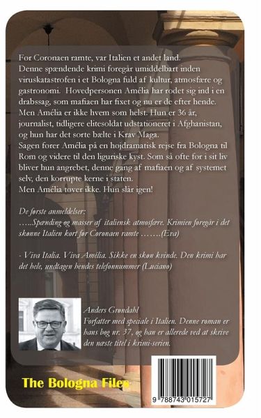 Før Coronaen ramte, var Italien et andet land. Denne spændende krimi foregår umiddelbart inden viruskatastrofen i et Bologna fuld af kultur, atmosfære og gastronomi. Hovedpersonen Amélia har rodet sig ind i en drabssag, som mafiaen har fixet og nu er de efter hende. Men Amélia er ikke hvem som helst. Hun er 36 år, journalist, tidligere elitesoldat udstationeret i Afghanistan, og hun har det sorte bælte i Krav Maga. Sagen fører Amélia på en højdramatisk rejse fra Bologna til Rom og videre til den liguriske kyst. Som så ofte før i sit liv bliver hun angrebet, denne gang af mafiaen og af systemet selv, den korrupte kerne i staten. Men Amélia tøver ikke. Hun slår igen!