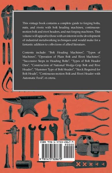 This vintage book contains a complete guide to forging bolts, nuts, and rivets with bolt heading machines, continuous-motion bolt and rivet headers, and nut forging machines. This volume will appeal to those with an interest in the development of industrial metalworking techniques and would make for a fantastic addition to collections of allied literature. Contents include: "Bolt Heading Machines", "Types of Machines", "Operation of Plain Bolt and Rivet Machines", "Successive Steps in Heading Bolts", "Types of Bolt Header Dies", "Construction of National Wedge-Grip Bolt and Rive Header", "Hammer Type of Bolt Header", "Stock Required for Bolt Heads", "Continuous-motion Bolt and Rivet Header with Automatic Feed", et cetera. Many vintage books such as this are increasingly scarce and expensive. We are republishing this volume now in an affordable, modern edition complete with a specially commissioned new introduction on metal work. First published in 1914.
