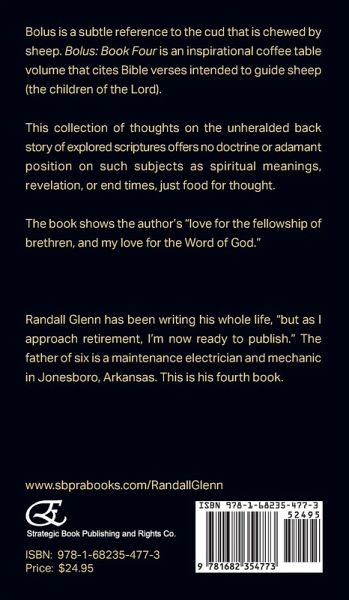 Bolus is a subtle reference to the cud that is chewed by sheep. Bolus: Book Four is an inspirational coffee table volume that cites Bible verses intended to guide sheep (the children of the Lord). This collection of thoughts on the unheralded back story of explored scriptures offers no doctrine or adamant position on such subjects as spiritual meanings, revelation, or end times, just food for thought. The book shows the author's "love for the fellowship of brethren, and my love for the Word of God." (About the Author) Randall Glenn has been writing his whole life, "but as I approach retirement, I'm now ready to publish." The father of six is a maintenance electrician and mechanic in Jonesboro, Arkansas. This is his fourth book.