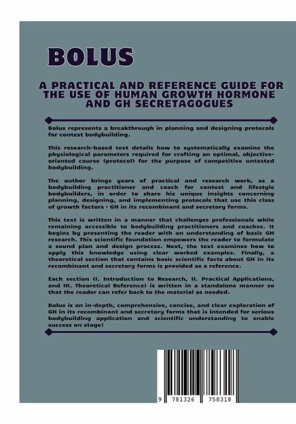 Bolus is a practical and reference guide for the use of recombinant human growth hormone (rhGH; GH) and GH secretagogues (GH releasing peptides). Bolus represents a breakthrough in planning and designing protocols for contest bodybuilding and anti aging applications. This research-based text details how to systematically examine the physiological parameters required for crafting an optimal, objective oriented course (protocol) for the purpose of competitive untested bodybuilding. The author brings years of practical and research work, as a bodybuilding practitioner and coach for contest and lifestyle bodybuilders, in order to share his unique insights concerning planning, designing, and implementing protocols that use this class of growth factors - GH in its recombinant and secretory forms. This text is written in a manner that challenges professionals, and includes in its intended audience doctors and chemists, while remaining accessible to bodybuilding practitioners and coaches. It begins by giving the reader the basic tools for understanding GH research. This scientific foundation empowers the reader to formulate a sound plan and design process. Next, the text examines how to apply this knowledge using clear worked examples. Finally, a theoretical section that contains basic scientific facts about GH in its recombinant and secretory forms is provided as a reference. Each section (1. Introduction to Research, 2. Practical Applications, and 3. Theoretical Reference) is written in a standalone manner so that the reader can refer back to the material as needed.