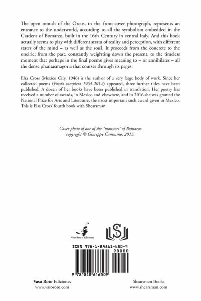The open mouth of the Orcus, in the front-cover photograph, represents an entrance to the underworld, according to all the symbolism embedded in the Gardens of Bomarzo, built in the 16th Century in central Italy. And this book actually seems to play with different strata of reality and perception, with different states of the mind – as well as the soul. It proceeds from the concrete to the oneiric; from the past, constantly weighting down the present, to the timeless moment that perhaps in the final poems gives meaning to – or annihilates – all the dense phantasmagoria that courses through its pages.