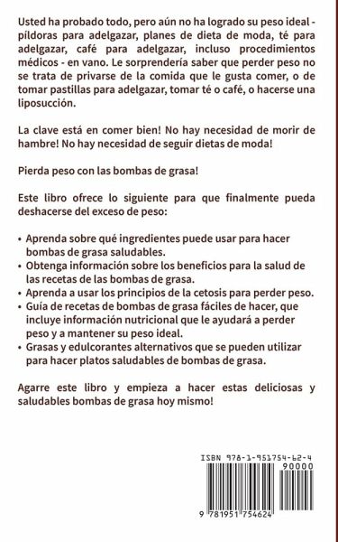 Usted ha probado todo, pero aún no ha logrado su peso ideal - píldoras para adelgazar, planes de dieta de moda, té para adelgazar, café para adelgazar, incluso procedimientos médicos - en vano. Le sorprendería saber que perder peso no se trata de privarse de la comida que le gusta comer, o de tomar pastillas para adelgazar, tomar té o café, o hacerse una liposucción. La clave está en comer bien! No hay necesidad de morir de hambre! No hay necesidad de seguir dietas de moda!Pierda peso con las bombas de grasa! Este libro ofrece lo siguiente para que finalmente pueda deshacerse del exceso de peso:Aprenda sobre qué ingredientes puede usar para hacer bombas de grasa saludables. Obtenga información sobre los beneficios para la salud de las recetas de las bombas de grasa. Aprenda a usar los principios de la cetosis para perder peso. Guía de recetas de bombas de grasa fáciles de hacer, que incluye información nutricional que le ayudará a perder peso y a mantener su peso ideal. Grasas y edulcorantes alternativos que se pueden utilizar para hacer platos saludables de bombas de grasa. Agarre este libro y empieza a hacer estas deliciosas y saludables bombas de grasa hoy mismo! Usted ha probado todo, pero aún no ha logrado su peso ideal - píldoras para adelgazar, planes de dieta de moda, té para adelgazar, café para adelgazar, incluso procedimientos médicos - en vano. Le sorprendería saber que perder peso no se trata de privarse de la comida que le gusta comer, o de tomar pastillas para adelgazar, tomar té o café, o hacerse una liposucción. La clave está en comer bien! No hay necesidad de morir de hambre! No hay necesidad de seguir dietas de moda! Pierda peso con las bombas de grasa! Este libro ofrece lo siguiente para que finalmente pueda deshacerse del exceso de peso:Aprenda sobre qué ingredientes puede usar para hacer bombas de grasa saludables. Obtenga información sobre los beneficios para la salud de las recetas de las bombas de grasa. Aprenda a usar los principios de la cetosis para perder peso. Guía de recetas de bombas de grasa fáciles de hacer, que incluye información nutricional que le ayudará a perder peso y a mantener su peso ideal. Grasas y edulcorantes alternativos que se pueden utilizar para hacer platos saludables de bombas de grasa. Agarre este libro y empieza a hacer estas deliciosas y saludables bombas de grasa hoy mismo!