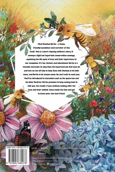 Meet Bombus Bertie - a fuzzy, friendly bumblebee (and narrator of this book). This is a short rhyming children's story. It conveys a light but important conservation message, explaining the life cycle of bees and their importance to our ecosystem. It's fun, factual, and educational. Bertie is a loveable character, he describes the important job that bees do and how we can all help to keep them safe. Bombus is his Latin name, and Bertie is his chosen name. He can't wait to meet you. You'll be introduced to characters such as the queen bee and his sister Beatrice. Bertie promises to keep coming back to visit you, the reader if you continue looking after the bees and their habitat. Come inside the hive and get to know your new best friend.