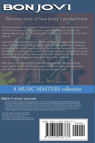 "Alternative" may have taken over the rock world in the 1990s, but at least one band proved you could still do real rock and do it with showmanship and style: Bon Jovi, arena rockers who have seen a million faces and rocked them all. BON JOVI: THE COMPLETE STORY OF NEW JERSEY'S BIGGEST BAND takes dozens of freely available Wikipedia articles and brings them together into a convenient print package that tells the entire story of Bon Jovi, from their formation to the recording of their albums to the legacy they leave behind. Insights into their songs, how their albums came about, the band member's lives outside the band - it has it all! For those who like the convenience of a traditional print book rather than reading articles on the web, BON JOVI: THE COMPLETE STORY OF NEW JERSEY'S BIGGEST BAND brings together the best freely available public domain and creative commons material about Bon Jovi and assembles it into one sleek print package. Enjoy!