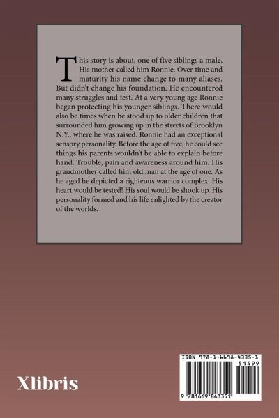 This story is about, one of five siblings a male. His mother called him Ronnie. Over time and maturity his name change to many aliases. But didn't change his foundation. He encountered many struggles and test. At a very young age Ronnie began protecting his younger siblings. There would also be times when he stood up to older children that surrounded him growing up in the streets of Brooklyn N.Y., where he was raised. Ronnie had an exceptional sensory personality. Before the age of five, he could see things his parents wouldn't be able to explain before hand. Trouble, pain and awareness around him. His grandmother called him old man at the age of one. As he aged he depicted a righteous warrior complex. His heart would be tested! His soul would be shook up. His personality formed and his life enlighted by the creator of the worlds.