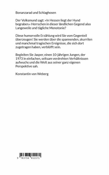 Bonanzarad und SchlaghosenDer Volksmund sagt: »In Hessen liegt der Hund begraben.«Herrschen in dieser ländlichen Gegend also Langeweile und tägliche Monotonie?Diese humorvolle Erzählung wird Sie vom Gegenteil überzeugen! Sie werden über die spannenden, skurrilen und manchmal tragischen Ereignisse, die sich dort zugetragen haben, verblüfft sein.Begleiten Sie Jasper, einen zehnjährigen Jungen, der 1973 in einfachen, seltsam verdrehten Verhältnissen aufwuchs und die Welt aus seiner ganz eigenen Perspektive sah.Konstantin von Weberg