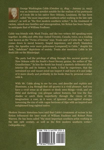 George Washington Cable (October 12, 1844 - January 31, 1925) was an American novelist notable for the realism of his portrayals of Creole life in his native New Orleans, Louisiana. He has been called "the most important southern artist working in the late 19th century", as well as "the first modern southern writer." In his treatment of racism, mixed-race families and miscegenation, his fiction has been thought to anticipate that of William Faulkner. He also wrote articles critical of contemporary society. Due to hostility against him after two 1885 essays encouraging racial equality and opposing Jim Crow, Cable moved with his family to Northampton, Massachusetts. He lived there for the next thirty years, then moved to Florida. Cable was friends with Mark Twain, and the two writers did speaking tours together. In 1884 and 1885 they visited Toronto, Canada, twice, on a reading tour known as the "Twins of Genius" tour. Twain said of Cable that "when it comes down to moral honesty, limpid impotence, and utterly blameless piety, the Apostles were mere policemen [compared] to Cable," despite his dark, "indelicate" depictions of society. Twain also mentions Cable in his book Life on the Mississippi: The party had the privilege of idling through this ancient quarter of New Orleans with the South's finest literary genius, the author of "the Grandissimes." In him the South has found a masterly delineator of its interior life and its history. In truth, I find by experience, that the untrained eye and vacant mind can inspect it and learn of it and judge of it more clearly and profitably in his books than by personal contact with it. With Mr. Cable along to see for you, and describe and explain and illuminate, a jog through that old quarter is a vivid pleasure. And you have a vivid sense as of unseen or dimly seen things--vivid, and yet fitful and darkling; you glimpse salient features, but lose the fine shades or catch them imperfectly through the vision of the imagination: a case, as it were, of ignorant near-sighted stranger traversing the rim of wide vague horizons of Alps with an inspired and enlightened long-sighted native. Modern literary historians have said that Cable's treatment of racism in his fiction influenced the later work of William Faulkner and Robert Penn Warren. He has been called "the most important southern artist working in the late 19th century, as well as the first modern southern writer." In 2008 a new edition of his history of the South, including footnotes and research, was published by Louisiana State University Press under the title, The New Orleans of George Washington Cable: The 1887 Census Office Report, edited and with an introduction by Lawrence N. Powell. Cable may have coined the term "authors' editor", in his 1910 tribute to his editor Richard Watson Gilder, when he wrote "I think he was peculiarly an authors' editor, and not merely a publishers'."; this is the earliest known use of the term in print. (wikipedia.org)