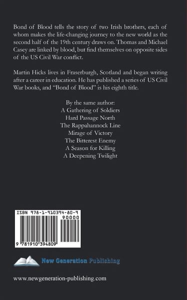 Bond of Blood tells the story of two Irish brothers, each of whom makes the life-changing journey to the new world as the second half of the 19th century draws on. Thomas and Michael Casey are linked by blood, but find themselves on opposite sides of the US Civil War conflict. Martin Hicks lives in Fraserburgh, Scotland and began writing after a career in education. He has published a series of US Civil War books, and "Bond of Blood" is his eighth title. By the same author: A Gathering of Soldiers Hard Passage North The Rappahannock Line Mirage of Victory The Bitterest Enemy A Season for Killing A Deepening Twilight