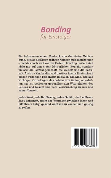 Sie bekommen einen Eindruck von der tiefen Verbindung, die Sie als Eltern zu Ihren Kindern aufbauen können - und das noch weit vor der Geburt. Bonding bezieht sich nicht nur auf den ersten körperlichen Kontakt, sondern umfasst die Schwangerschaft, die Geburt und die Babyzeit. Auch im Kindesalter und darüber hinaus lässt sich auf dieser tragenden Beziehung aufbauen. Ein Kind, das alle wichtigen Grundlagen des Lebens von Anfang an erhalten hat, ist resilienter gegenüber den Widrigkeiten des Lebens und besitzt eine tiefe Verwurzelung zu sich und seiner Umwelt.Jedes Wort, jede Berührung, jedes Gefühl, das bei Ihrem Baby ankommt, stärkt das Vertrauen zwischen Ihnen und hilft Ihrem Baby, gesund wachsen zu können und geistig zu reifen.Sie erfahren auch, welche Faktoren dafür ausschlaggebend sind und wie Sie diese leicht umsetzen können. Außerdem werden Vergleiche gezogen zwischen gebundenen und ungebundenen Babys und wie unterschiedliche Kulturen mit dem natürlichsten Vorgang der Welt umgehen. Auch gesellschaftliche Sichtweisen werden einbezogen und auf ihre Herkunft und Wirkung auf die Mutter-Kind-Beziehung erläutert.