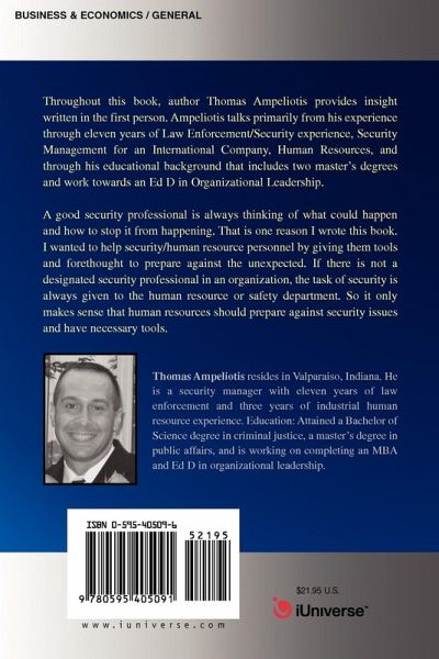 Throughout this book, author Thomas Ampeliotis provides insight written in the first person. Ampeliotis talks primarily from his experience through eleven years of Law Enforcement/Security experience, Security Management for an International Company, Human Resources, and through his educational background that includes two master's degrees and work towards an Ed D in Organizational Leadership. A good security professional is always thinking of what could happen and how to stop it from happening. That is one reason I wrote this book. I wanted to help security/human resource personnel by giving them tools and forethought to prepare against the unexpected. If there is not a designated security professional in an organization, the task of security is always given to the human resource or safety department. So it only makes sense that human resources should prepare against security issues and have necessary tools.